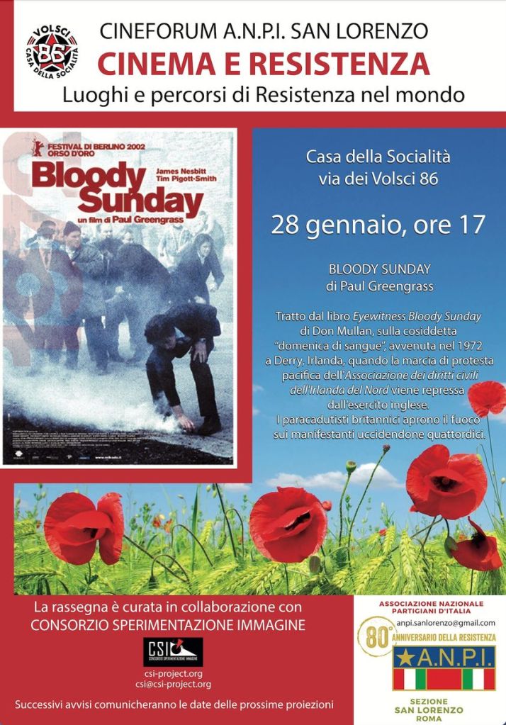 La proiezione è dedicata alla resistenza del popolo irlandese contro l’occupazione britannica. Verrà proiettato Bloody Sunday (2002) di Paul Greengrass.