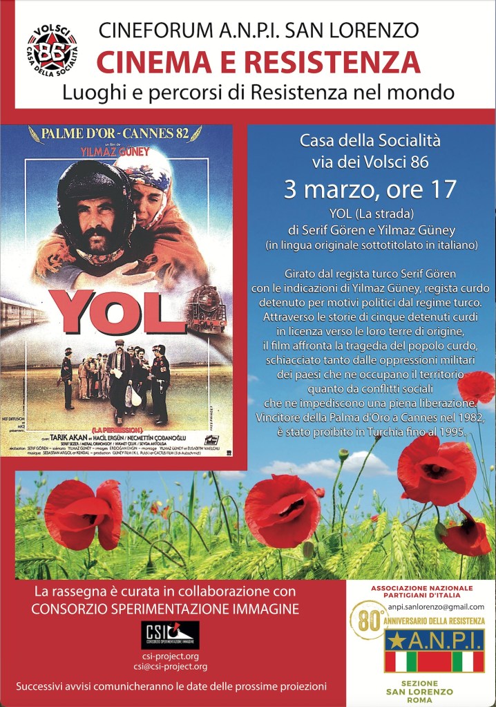 E’ un film del 1982 diretto dal regista turco Serif Gören sulla base delle indicazioni che gli aveva inviato dal carcere Yilmaz Güney, regista curdo detenuto dal regime turco per motivi politici. Attraverso le storie di cinque detenuti curdi in licenza verso le loro terre di origine il film traccia un dolente quadro della tragedia del popolo curdo, schiacciato tanto dalle oppressioni militari dei paesi che ne occupano il territorio quanto da conflitti sociali che ne impediscono una piena liberazione. Vincitore della Palma d’Oro a Cannes nel 1982, il film è stato proibito in Turchia fino al 1995.