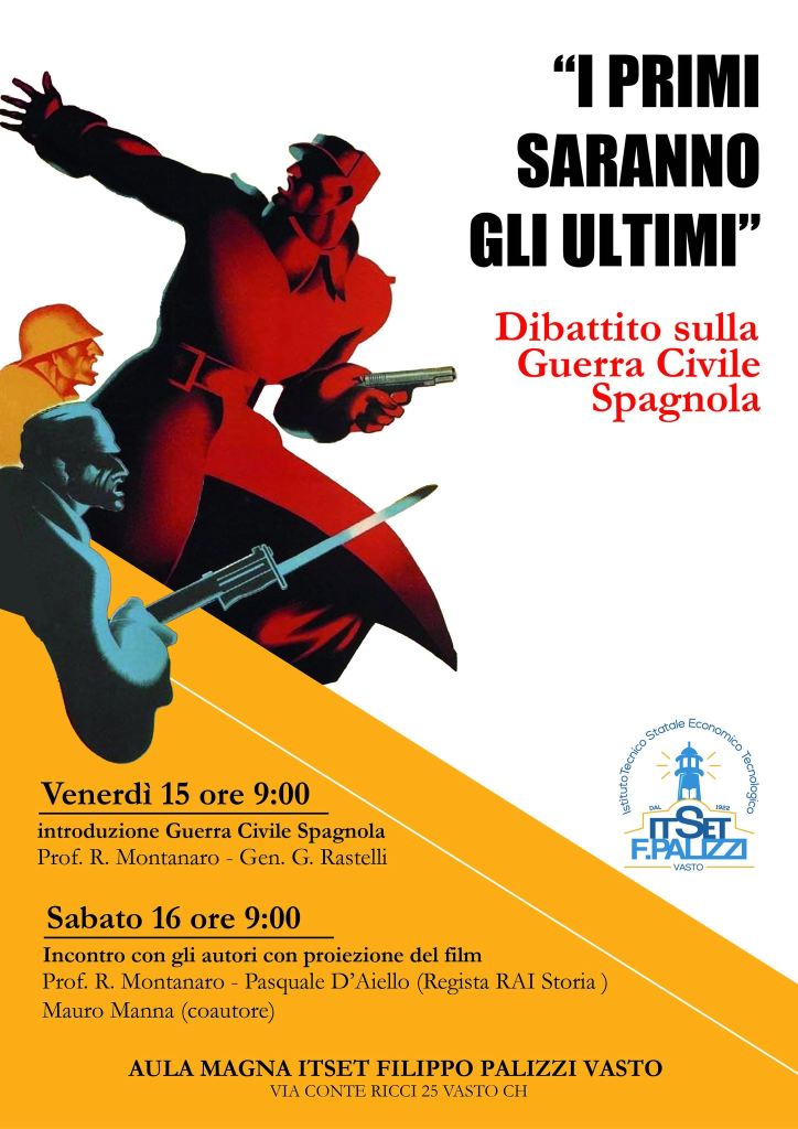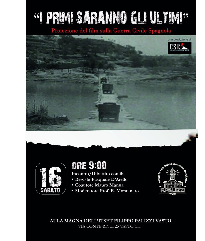 Siamo felici di comunicarvi che il nostro film dedicato alle memorie degli ultimi reduci repubblicani della guerra civile spagnola, I Primi Saranno gli Ultimi, sarà proiettato sabato 16 novembre 2024 presso la scuola superiore ITSET-Palizzi di Vasto (CH) dove saranno presenti anche studenti del liceo classico L.V. Pudente. Gli autori del film, Mauro Manna e Pasquale D’Aiello, parteciperanno alla proiezione e al dibattito con gli studenti. La scuola ha organizzato una due giorni approfondimento sulla guerra civile spagnola coordinato dal prof. Roberto Montanaro.