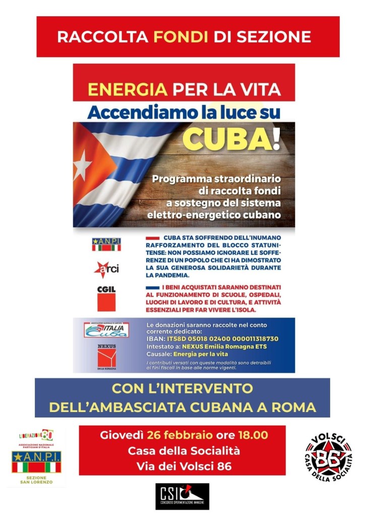 Per dare il nostro contributo alla resistenza di Cuba, insieme alla sezione ANPI di San Lorenzo, partecipiamo ad un aperitivo di sottoscrizione che si terrà